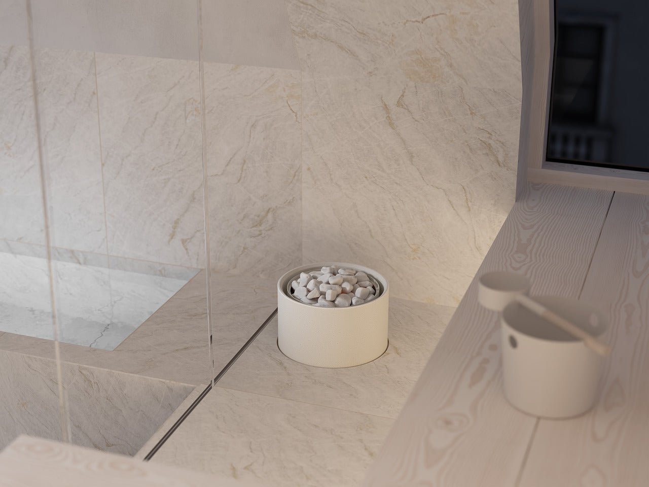 Die mehrschichtige Struktur hält die Oberfläche angenehm kühl und ermöglicht minimale Sicherheitsabstände. Der Pyry fügt sich fließend in die Architektur der Sauna ein, ohne Geländer, ohne Ablenkung. Nur Form, Material und Funktion in vollkommener Balance.